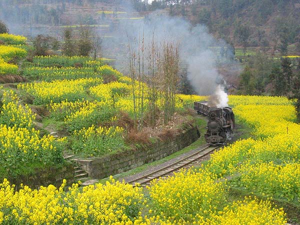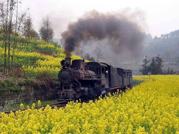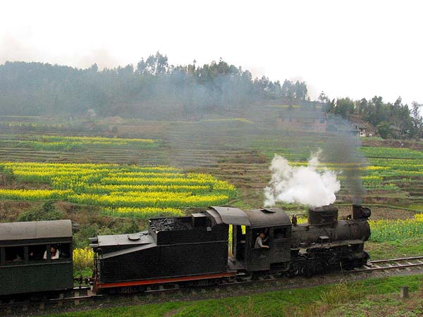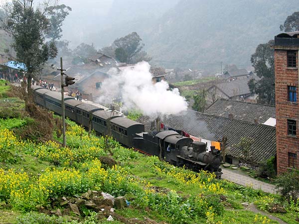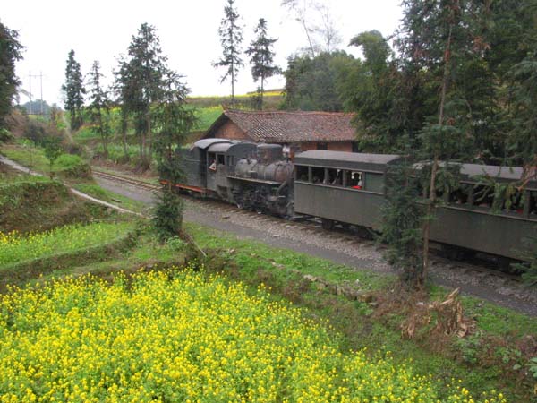 This brief report updates our June 2007 visit. Yuehong and I went to Shibanxi at short notice for a brief stay between 12th and 15th March 2008. On offer was a consultation/filming contract, alas it turned out on arrival that this involved working with CCTV, a devil there is not a long enough spoon in the world for us to sup with. When we quit, we had just a day and a half of photographic opportunity with most of our equipment in Beijing. Bear this in mind when reading what follows. Shibanxi Heaven - The best steam narrow gauge railway in the world on DVD when it was totally real (2004-2007). Shibanxi Gold - The best steam narrow gauge railway in the world on DVD as it evolves into a sustainable operation (2008-2011). Normally it snows here once every ten years or so, but the abnormal weather patterns that struck central and southern China brought three falls on 22nd, 28th and 30th January 2008; in each case it was all gone within a few hours but the effect on the local banana and bamboo plants will be felt for a long time to come. As a result, the early March yellow flower spectacle was a little late. The railway planned a festival with invited guests and media on 15th March, we only observed the first of two special trains (with 4 tourist coaches) as we left. We arrived just after a dull period with rain, had two days of half good weather and then escaped a soaking on the day of our departure. This gives an idea of 'Shibanxi Gold'. Firstly, a morning departure from Bagou with just a hint of yellow: