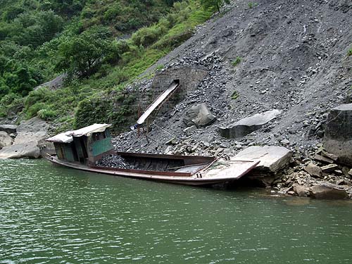 Click here for the main Shibanxi Holiday 2009 page. It was time to return to Ma Miao, east and south of Bagou on the map, our plan was to take a boat up to the dam below Huangdan (bottom left) visiting the waterside coal mines on the way. It was raining when we left Bagou, but not significantly, and we made good progress. This time the mine featured before was working and I spent an hour here mainly shooting video. The battery electric loco wa s in pieces and all horizontal movements were man powered. The first skips up were spoil which ascended the incline to be dumped: Later coal of dubious quality surfaced and was stockpiled: Tipping of the next wagon didn't go quite to plan, I have the extraordinary action on video: When I reached Ma Miao, our expected ferry was not available and we joined what appeared to be a regular Monday public ferry, with the promise it would go further than normal if we paid... By now the sun was out and I was wilting after all the rush to get filming complete, we had brought just one camera to keep the weight down. Even a cold beer couldn't revive me: The scenery was magnificent again, of course, and in due course we lost our passengers:
