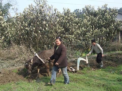 Click here for the main Shibanxi Holiday 2011 page. More in hope than expectation, I usually lift the blind in our guest house room at first light and today there was no sign of the hills at all, so I crawled back under the duvet. Sometime later after a trip to the bathroom, I noticed that the blind was unusually bright, the sun had burned away the mist and there was no time to waste. The hike in the hills was immediately cancelled and the rest of the group alerted to the change of plan. I left Yuehong to wait for the others and shot up towards Xianrenjiao. The new road above Jiaoba is easy to find and use. After the second tunnel from Bagou take the path on the right just before the first of the lineside houses through the reforested tip. Higher up follow the road past its summit until rounding a bend you can see the Xianrenjiao mobile phone mast (I may curse the ugly creatures but they make great landmarks), at the next junction bear left along a path to the small group of houses. Go straight ahead between two of them down a path through the bamboos and cross the small arched bridge. You can either descend to the railway or follow the path till it meets a truck road where you can turn left for the railway. Although I was a little pushed for time for the second passenger train, I had to take five minutes out along the way to capture a couple ploughing with their water buffalo. Around the corner, a peach tree was in full blossom: