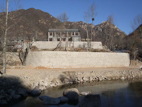 Two large earth movers were hired for two weeks at a bargain price, reliably reported, of only 3000 Yuan, each, per day. And since large amounts of infill were needed, what a clever idea to dredge the local stream bed! In almost no time, the boundary wall was racing upwards.