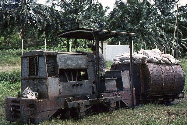 This is a second view of the same locomotive, John reported another Model 40DL here (259187/1948). The contents of the sacks are not known, possibly they were the kernels of the palm oil fruits which could be burned as a fuel although not in steam locomotives as in North Sumatra across the Straits of Malacca.. (JB) |