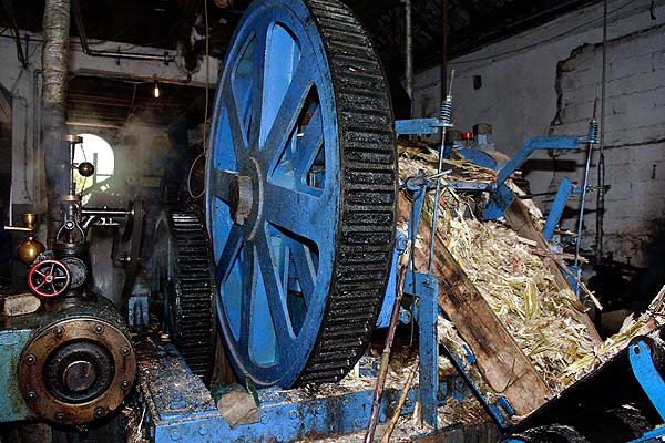 "Have some Madeira, M' dear!", it brings back that wonderful Flanders and Swann song about a seduction which starts... "She was young, she was pure, she was new, she was nice. Recognise someone? For the result see http://sniff.numachi.com/pages/tiMADERA.html. or http://www.ovff.org/pegasus/songs/madeira.html. And if you are not familiar with their work, I can assure you that they were pillars of the establishment some 50 or so years ago. But I digress... This page has been updated by Dave Colier's 2015 report (1st January 2016). According to this page there is some 'preserved' equipment at Funchal - http://www.practicalmachinist.com/vb/antique-machinery-history/1907-sugar-cane-mill-machinery-madeira-some-large-photos-226567/ - the kit includes a mill engine made by Harvey Engineering Co Ltd of Glasgow in 1907 (added 27th October 2013). It is described as follows - "This, and the mill chimney, are all that remains of a large sugar mill in the centre of Funchal on the Portuguese island of Madeira. The site is now a garden, the Jardim de Santa Luzia, alongside a road called the Rua 31 De Janeiro, ½ mile from Funchal marina. Easily found using the chimney as a landmark." John Raby has been to Madeira and this is what he found: Madeira has a number of small rum distilleries which take local sugar cane and crush, ferment and distil the cane liquid to make rum. One of these which is open to visitors is at Calheta on the south west coast. The Engenhos de Calheta is a working museum with a mix of steam and electric power crushing, heating and transporting the crushed cane and liquids. (Sadly the steam part was history by 2015. RD) The raw cane enters and a pair of crushers (1 steam, 1 modified to electric) do the initial crushing.