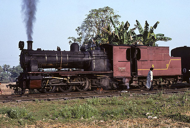The YFs survived in Assam after their extinction elsewhere. Whereas those on the Western Railway were converted to 2-6-2s, most of the NFR examples remained as 0-6-2s. 30390 was built by Krupp in 1931 and was photographed at Samaguri on a local train between Chaparmukh Junction and Silghat Town in January 1979. (KR) |