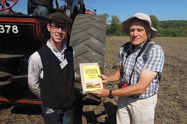 This is one of a series of pages I have uploaded to illustrate facets of the steam rallies we have attended in the UK. Click here for the 2018 introduction and overall index. Any organisation concerned with the preservation of steam age machinery knows that it has to mount regular education exercises to ensure that the necessary skills are passed to a younger generation and thereby maintained. For the Steam Plough Club, this takes the form of regular 'Hands-On' events which allows beginners to get started; for fairly obvious reasons, these events are neither advertised nor open to the general public. Non-participating members of the club are naturally welcome to attend as observers and this we did on the Sunday afternoon at a farm on the Leicestershire/Rutland border. Steam ploughers at rallies have to contend with ground which is rarely ideal, but on this occasion the Nourish family had made available a field which must have been near perfect. The six engines present were all facing north as the land rose slightly in that direction, so they were best photographed conventionally in the late afternoon as the weekend came to a close. On the hill behind is the magnificently appointed farmhouse of the hosts. Choose the page you are interested in and within that, click on a thumbnail for a larger image. Then click again to return to the page. I had my own brief place in the sun, as I had brought along a spare copy of the classic book 'Ploughing with Steam' by Haining and Tyler which I wanted to pass on to a suitable young enthusiast. The organiser immediately nominated 18 year old Ruben Van Opstal from Belgium. Together with his father Noach (in thumbnail above) and Gijs Koolen they had made the long trip for an experience which is unavailable back home. |