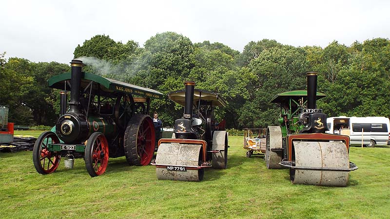 This is one of a series of pages which I have uploaded to illustrate facets of steam rallies we have attended in the UK. Such events occur all over the country in the summer months, they are easily found by using your favourite search engine and may have anything between a handful of steam engines and hundreds (as at the Great Dorset Steam Fair which could probably be fairly described as having an excess of riches). Click here for the overall 2018 index. After my 2015 visit I wrote "This is a relatively new event, in terms of steam it's not so much a small rally as a mini one, being mainly internal combustion orientated and without space for maybe more than half a dozen steam road engines. The venue is splendid, the grounds beside the historic Speech House in the heart of the Forest of Dean and with it being a one day event there is no room for error with the weather." 2017 had seen a similar show which was highlighted by the return to public view of the small Trotter steam roller and the 2018 show was near identical - with the addition of a steam powered saw bench. Now having my own 4 wheel transport I was able to follow some of the engines on the way to and from the show which obviously was much more fun than watching them sitting boiling water. This was my three road stars on arrival on the Saturday, hence the absence of punters. Earlier in the afternoon I had enjoyed a minute or so of ecstasy as they climbed the hill out of Parkend. Click this link https://youtu.be/XY0rX54mVSE or the picture to see a short YouTube video clip. There is a second longer clip available which includes the first one - https://youtu.be/0fxSjTalJ0c. Steam Rollers