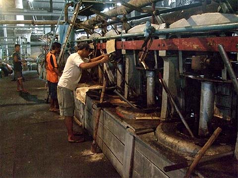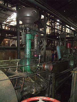This series of pages from July and August 2010 records our travels from China to Malaysia and on to Java, Indonesia where we were hosting the 'Steamy Java Tour 2010'. Click here for the main Winds of Change index page. Rejosari was a 'Halle' mill, it was featured in their advertising material and several of its engines are still here including the four in the main mill line. In recent years, it has gained a reputation for being difficult to penetrate owing to the less than welcoming attitude of its chief engineer. As a result we scheduled our visit after the loco tour had checked in and, more importantly, after he would have finished his day's work. Of course, we paid the admission fee but we based ourselves in the chemistry laboratory to avoid the engineers' office. In the event, we were treated with some suspicion by the Satpam (security) but they were readily satisfied by our paperwork and we were left free to roam as we wanted as had been the case in every other mill so far. Despite sharing the same manufacturer only the first and second mill engines are similar, with slide valves with twin eccentrics. The third engine is a drop valve engine and the fourth engine has slide valves with triple eccentrics and a complex governor. The blue cylinder appears to be part of a pressure balancing system for the mill rollers. Space is at a premium in this part of the mill and photography is not easy.