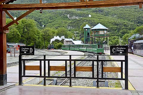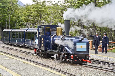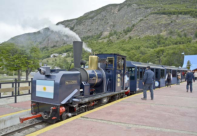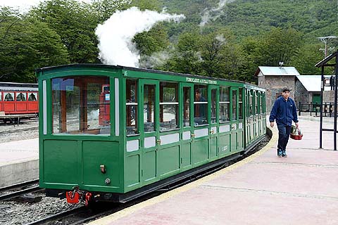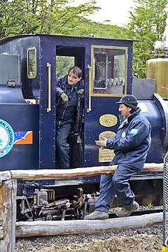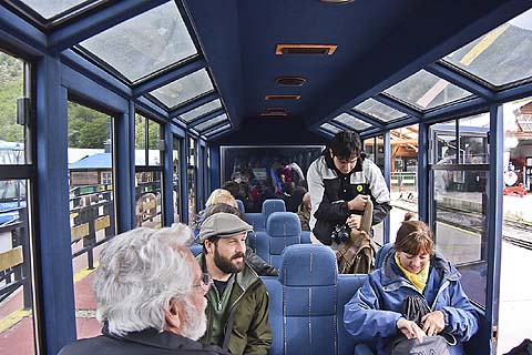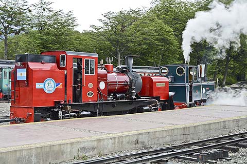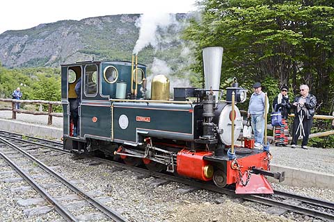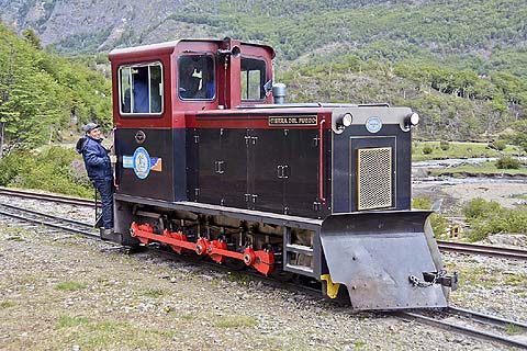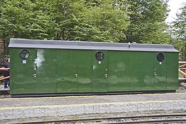 While we were waiting to board our train, locomotive No.3, Camilla, backed in with a rake of green coaches and then took on water before dropping back to the engine shed and pulling red Garratt Ing. H.R. Zubieta into the yard. Our train was headed up by blue liveried Garratt N2 and what appeared to be the newest iteration of FCAF coaching stock in companion blue. As the train leaves the station a history of the Ushuaia, the prison and the railroad, including significant features along the line is broadcast via an iPod over speakers in the coaches. The narration ends just short of the National Park station at the end of the line. Leaving the End of the World station, our train stopped a short distance out of the yard where an 0-6-0 diesel built in South Africa by Girdlestone Rail Company and named Tierra del Fuego, was coupled ahead of the N2. This diminutive locomotive was taken off at La Macarena station. and returned to Ushuaia with a maintenance train of permanent way crew of eight men and all their tools! While we waited at La Macarena station for those who wanted to visit the falls, Camilla arrived, dropped off a couple of individuals and returned to Ushuaia ahead of Tierra del Fuego. We then proceeded on to the end of the line where we reboarded our tour buses for a further excursion into the park before returning to the ship. Jack has provided a number of pictures of the trip, the subjects should be clear from the text above. The final vehicle might appear to be a reminder of the line's former purpose but is actually what we in the UK would appropriately call a Portaloo.