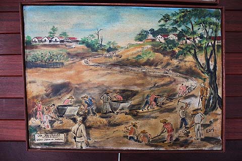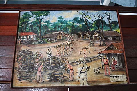 Another line, 22 km long, was opened from St-Laurent to the Charvein sawmill (northeast towards Mana). In addition a number of permanent and temporary branches were laid as required to various work and forest camps. Aside from the three steam locos, Asian buffalos were also used, while most single-car workings were powered by convicts, who either pushed the cars by hand or propelled them with bamboo poles. While photos of loco-hauled trains carrying newly-arrived convicts show them being transported on open flat wagons, passenger trains of open-sided toast rack coaches for officers of the prison administration and their families also operated on weekends. The railway appears on some of Francis Lagrange’s paintings on display at the Musée Départemental Alexandre Franconie in Cayenne.