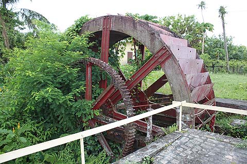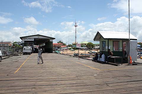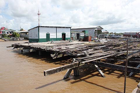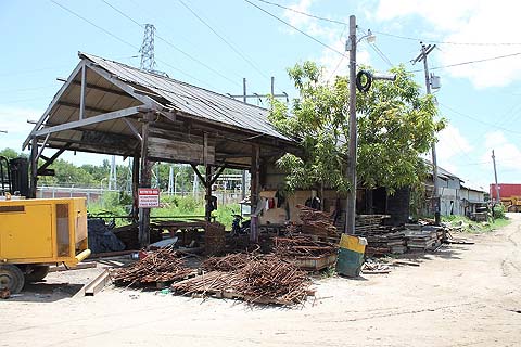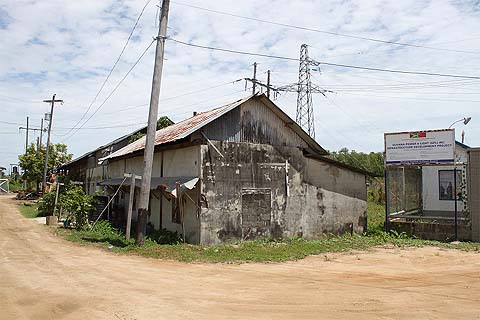 Activity at the Vreed-en-Hoop stelling (= pier, quay) has been reduced since construction of the Demerara River floating bridge, which meant an end for the ferry service. Speedboats however still connect the stelling with Stabroek market in Georgetown right across the river. We found the old railway station hidden behind a row of shops. While it was still complete a few years ago, the yard has recently been turned into a Guyana Power & Light Inc. compound. Part of the station building