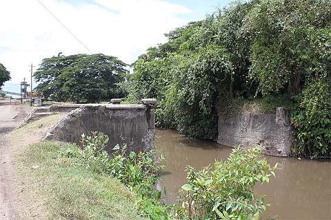 In front of the gate of GuySuCo’s Uitvlugt Sugar Factory (12 miles west of Vreed-en-Hoop), the railway crossed a canal on a small bridge, of which only the concrete abutments are
