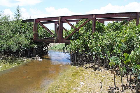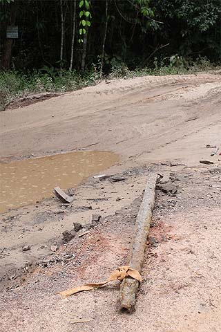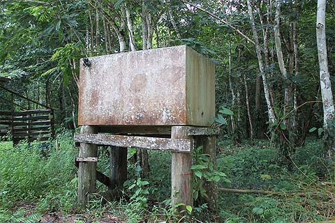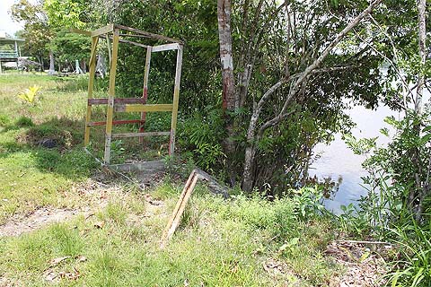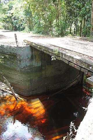 We chartered a taxi to take us to Rockstone. The unmarked turn-off is 7 miles from Linden on the unpaved Linden – Lethem Road (on the border to Brazil), from where it’s another 14 miles to Rockstone. Once we got there, we couldn’t at first find anything reminding us of the railway, apart from a steel water tank. When we asked a local Amerindian lady, she told us that the dirt road we drove over to get there was the former railway and that after strong rains, old rails sometimes stuck out of the mud. She also showed us a rail sticking out of the ground in front of her house, with the vegetation in the back being the old wooden pier. On the way back, we noticed that the bridges were former railway bridges and noticed many rails.