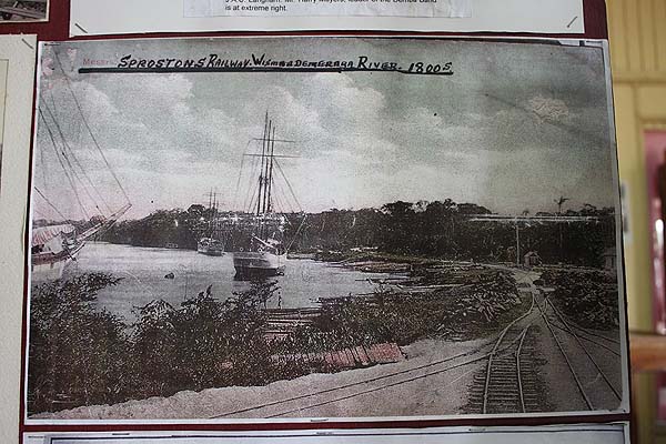 In 1897, a 18¾-mile long metre gauge railway was opened between Wismar, on the West bank of the Demerara, and Rockstone, on the east bank of the Essequibo. River navigation on the Essequibo lower course of the Essequibo was hampered by a number of falls, while Wismar could be reached from Georgetown by river steamer. The objective was to access the new Potaro goldfields inland. Sprotson’s already operated a fleet of river steamers. The opening of the line also encouraged the development of logging in the area (photos at Linden Museum of Industrial & Socio-Cultural Heritage).