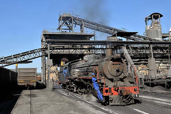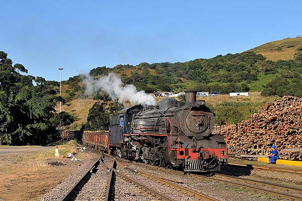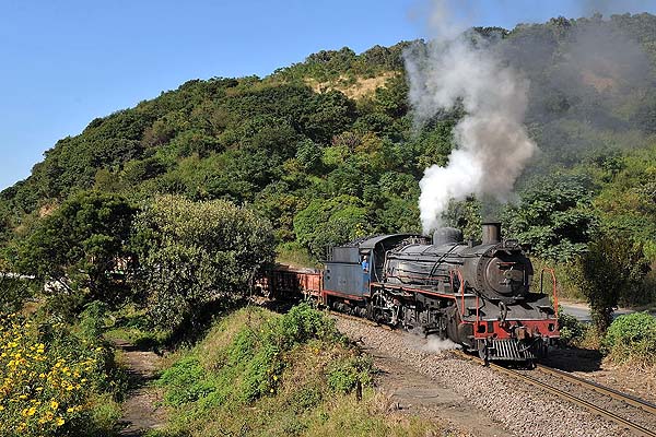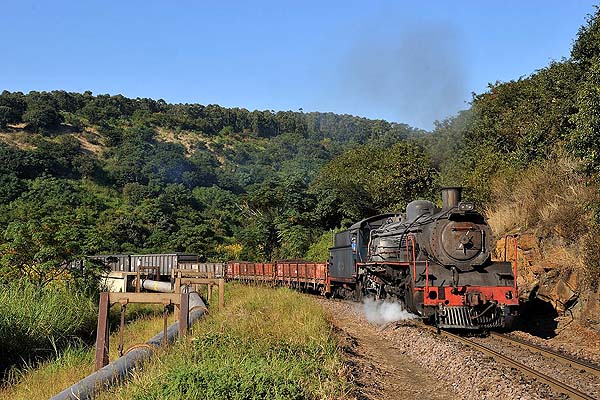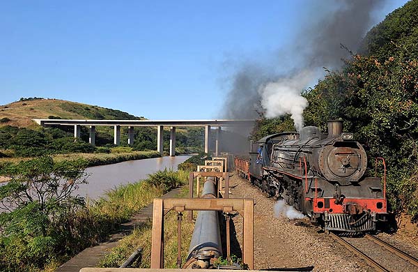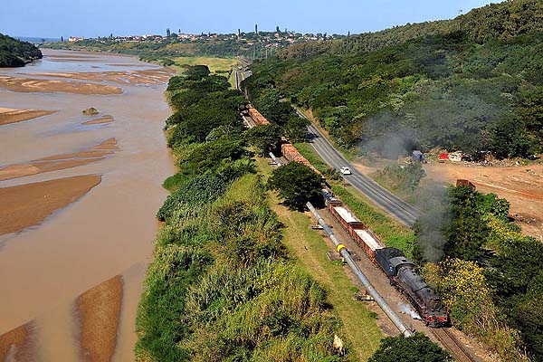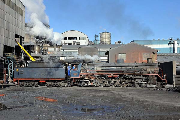 approx. 50 km south of Durban. This is the last industrial steam operation in South Africa. We spent four days to take photos of the The pulp mill was originally built in the early 1950s on the south bank of the Umkomaas (Mkhomazi) river upstream from the village. The factory is linked by a private railroad of just under 3 km running largely along the river bank and next to a public road to a connection with the SAS electrified Durban/Port Shepstone line just north of Umkomaas station. The railway is used to deliver inbound raw materials pulp wood from forests north of Durban, coal from Free State mines, limestone from near Port Shepstone and imported sulphur. The mill railway works 24 hours a day all year round with shift changes at 8am, 4pm and 12am. Three steam locos are on site and all are painted in blue colour. No 1 (ex-Spoornet 2697, Borsig 14748/1938), No 2 (ex-Spoornet 2633, Skoda 928/1938), No 3 (ex Spoornet 2767, Robert Stephenson Hawthorn 7280/1947). While we were visiting, No 3 was running, No 2 in inspection, No 1 in reserve. All engines are usable and they are rotated in use on a four-weekly cycle. No 3 is promised to an UK preserved railway, but Sappi Saiccor will continue to work with the steam locos, so you probably can see them work during the football World Cup in 2010.