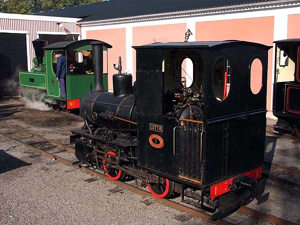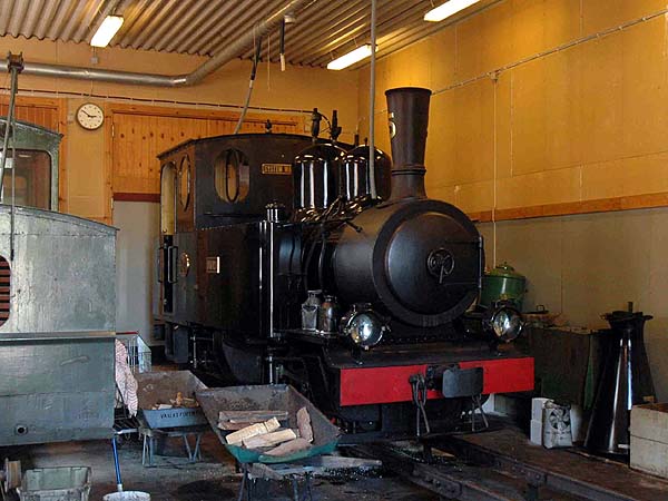 No. 2 (Motala 272/1901). One of half a dozen extremely well-built little 2-4-2 well and side tank 12-tonners from Motala Works, between 1894 and 1904 and now the only surviving one. The design had its origins in the need to replace the Decauvulle-type Mallet tanks on the Swedish 600mm gauge as their shortcomings became apparent. Supplied new to the Stavsjö Järnväg but sold by them as early as 1918 to Ballangen iron ore mine near Narvik in northern Norway. Reboilered in 1938 and acquired by the OSlJ in 1965. The loco has always been named “Virå” after the upper terminus of the StJ. Kurt Moller writes “a gem, YES; everybody´s darling engine here. Steams beautifully and runs like an angel - better than any of our coaches do. Our max. permitted speed on the ÖSlJ is 15 mph - VIRÅ does 35 easily...”