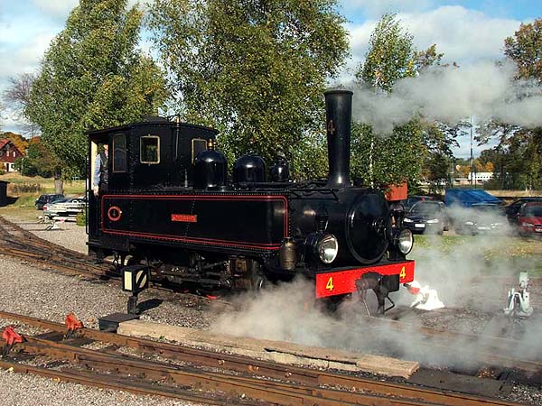 No. 3 (OK 7443/1918). Originally similar to no. 1. Ex-Strå Limestone Works no.1 at Dylta, near Örebro. Given to the society in 1960 and rebuilt into a 0-4-2 well and side tank in the 1970s. Regularly used in traffic early and late in the operating season and named "Dylta”. No. 4 (Motala 520/1914). Built for the Nättraby - Alnaryd - Elmeboda Järnväg in Blekinge on the southern Baltic coast. The design was an enlargement of the Motala 2-4-2T’s. Worked on the NAEJ until the line closed in 1945 when it was sold to Aspa pulp mill at the northern tip of Lake Vättern. The Aspa mill was a major buyer of stock from the public 600mm gauge railways of Sweden as they closed from the 1930’s onwards and was the source of much of the society’s collection. The mill’s railway was closed in 1951 and the loco was put into store. After preservation locally for some years it was acquired by the society in 1967 and returned to service in 1975. The loco still has its original boiler and firebox and will need a new one fairly shortly. Fitted with both well & side tanks. Like most of the NAEJ locos it carries a Latowski steam bell Has always been named “K.M. Nelsson” after one of the leading lights in the NAEJ.