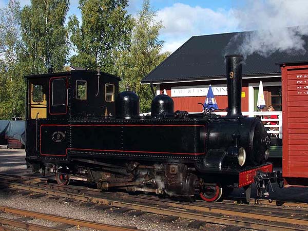 No. 6 (Hanomag 10194/1923). Ex-PKP no. Tx4-559, a more or less standard German 0-8-0T, bought from Poland by one of the railway’s supporters in the middle 1970s; operated in decaying condition until 1985 when it was dismantled for a complete overhaul which has never been completed as the boiler was found to be beyond repair. Named "Christina Hjelm" after the donor’s daughter. No. 7 Hudswell Clarke 346/1889. A tiny 0-4-2ST, the first 600mm gauge loco in Sweden and the oldest preserved HC loco of any gauge. Spent its working life at Eds Paper Mill and has always been named “Helgenäs”. Retired in the 1950’s and given to the society in about 1965. In limited service from about 1970 until about 1990 when the boiler was condemned and the loco was dismantled. Sadly the society’s current need is for larger locos to work the Taxinge extension and there’s little prospect of this loco being reassembled in the foreseeable future - see below 10 for a picture. No. 8 (Hartmann 4290/1919). A standard 0-8-0T Heeresfeldbahn loco, sold new to Emsfors Paper Mill in about 1920, one of two of these locos which worked there. The loco arrived at Mariefred about 1971, was named “Emsfors” and has been one of the railway’s most reliable locos ever since. The Ohs Bruk Järnväg, a 15km preserved line in southern Sweden, has its sister engine (Hartmann 4183/1919) which now carries the same name. There are pictures of 8 above and more in James' previous report. No. 9 (Motala 568/1915). A similar loco to no. 4 and supplied new to the Jönköping - Gripenbergs Järnväg where it worked until the line closed in 1935. Freight traffic from the Huskvarna machine factory (of chainsaw fame) for transhipment to the standard gauge at Jönköping was an important source of revenue for the line and doubtless no. 9 carried its fair share of this. The loco moved to the Aspa pulp mill in 1935 where it was joined by no. 4 (above) in 1945. The loco was acquired by a museum at Skärstad, near Husqvarna after the closure of the Aspa mill’s railway. It’s now on loan to the OSlJ from the museum under a sharing arrangement and steamed for the first time in public in preservation on 26th September 2009.