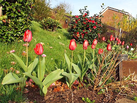 The tulips have turned out to be predominantly red for reasons I cannot fathom. At the moment they are at their most striking in the upper garden.