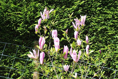 This page is part of a series of garden blogs from 2024. Click here for the index. This year we returned from Penang a full month later than in 2023 and this together with a reportedly mild winter meant that we missed the snowdrops, the crocuses and the best of the hyacinths. It had also been very wet as evidenced by one corner of our living room ceiling. Click on a picture for a larger version and click on that to return to this page. Frankly the UK in 2024 is a pretty depressing place to be, but only if we go all the way down our 33 steps. Up here in the clouds, it's another matter altogether, it's not perfect, of course, but we can control our environment to a certain extent. With the amount of rain that was coming down, then sooner or later the sun was always going to force its way through, that's as good a double rainbow as we have ever seen here. As always, early mornings were best for sunshine, just as well with the hill behind, of course we were all alone taking it in. Our #1 Magnolia Soulangeana was simply magnificent but there again it seems to get better year by year. It helped that there was neither a frost or strong wind during the critical period. At the other end of the garden there's another tree growing like a rocket, now that's not good news... It came as a 'gift' soon after we arrived. The azaleas in front of the spare bedroom have been outpacing their colleagues for some time, I'm not sure why. Some 5 years plus ago I gathered a lot of bluebell seeds from higher up and scattered them in front of the house and now they are thriving. Fortunately they will have died back before summer comes and then keep themselves hidden until next spring . Our tulips in the front are a bit of a lottery but these did well and it was unusual to see them out with the daffodils. Lidl had their usual bargains but their million bells, like those from other suppliers before them, were a near disaster. It's not us, we checked later deliveries at the supermarket and they were displaying the same symptoms. The hyacinths behind the house are always a bit later then those in the front which get more sun, it was just as well this year so we still saw them at their best. I'm not quite sure where the wallflowers came from and quite what inspired Yuehong to plant them in the bed next to the bungalow at the back, but it worked a treat. One has escaped into the front and will have to be returned here where it will do better it seems. The best tulips are always those in pots, they seem to drain well and the mice keep away from the house. The geraniums over wintered well but it's been too cold for them to thrive so far. On the bank behind then tulips, the baby Scarlet Wonder rhododendrons put on their best show ever. The Forsythia behind the kitchen has galls and has been heavily cut back, which has been good news for the Magnolia Susan. The unsightly stock fence has so far kept the Muntjacs out but I'm not celebrating yet - we had our first Roe Deer of the year tasting the few remaining roses at the front last week. I have never consciously planted forget-me-knots but if you just let them be when they find a suitable spot, they will reward you all summer long. These are in front of the upper wall at either end of the fuchsia bed. At long last I seem to have the Aubretia right here but they will have to battle the dahlias soon. I have to say that the white Juneberry behind didn't have a great season, maybe it's another plant that doesn't like its feet stuck in the equivalent of a bucket of water. There's all sorts of rubbish in the bed under the honeysuckle next to the summer house, but last year I attacked it and as a result these azaleas responded, they are perfectly placed for morning and midday sun. There are more Scarlet Wonder in front of the summer house. Behind, the Camellias and bluebells have put on their usual show. The bench wood has lasted just over 10 years as the salesman warned me. as I foolishly tried to save money on untreated wood. .. The view looking the other way is also special but I doubt there are (m)any other residents in our area who have noticed it from their properties. Last year Yuehong's baby apple tree was savaged by the deer, but as long as my defences hold then it has a chance to make a height where they can't reach the growth points. Behind we have lost a fair number of peonies, it's normally well drained but it seems that prolonged daily heavy rain overwhelmed them and the bluebells are thinner this year too. It's now the beginning of May and it's time for the larger rhododendrons (all 12 or so of them) to star. They will have to make the most of their chance as it turns out that some are too close together and have to be pruned every year, but they will be brilliant for 2-3 weeks as usual. It's finally turned mild, the grass and hedges are rocketing and the ground will soon be warm enough to plant out the dahlias. The list of jobs pending is growing and at the top is the worst one of all, cleaning the pond tank and its sponge filters of the fishy equivalent of pigeon poo. Click here for the next part and click here for the 2024 index. |