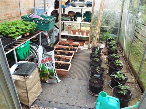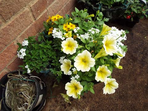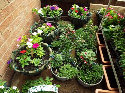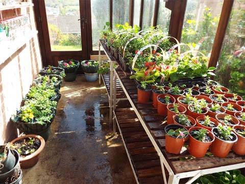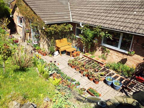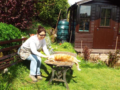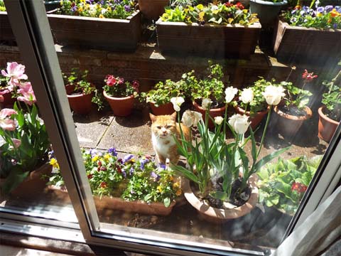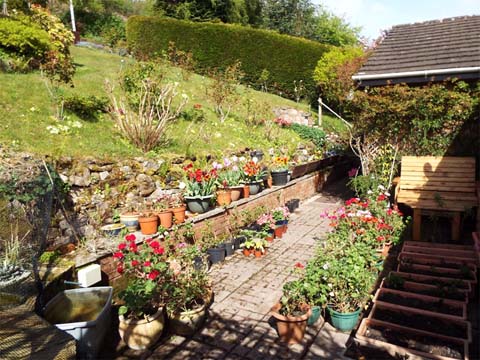 Click on a picture for a larger version and click on that to return to this page. The early red tulips faded as the later ones came through. The small azaleas and rhododendrons in front of the summer house had their brief day in the sun. On the other hand, the bluebells were brilliant, they are spreading out from their heartland above the summer house just as I hoped they would. Nearby, I spotted a single cowslip a couple of years ago and now we have a small cluster of them and there are now a couple just above the bungalow, but I don't think they will supplant the more aggressive primroses. The top bed is a mass of blue, a mixture of bluebells and forget-me-nots. Among them are nearly 30 peonies, most of them still 'young'. I put in canes over the winter so I know where they are and don't tread on them when they start to grow in the spring. In a couple of months I will have to do some weeding to remove unwelcome incomers. Just below our upper greenhouse nearby, the weigela (florida?) was given a year off pruning and is flowering well even if it hardly qualifies as 'spectacular'. Likewise the bush next to it which I now think is maybe a spiraea (arguta?) and will be covered in white flowers shortly. We have a surprise extra peony, the parish council has given up on the small garden next to the church now the gardening club which maintained it is defunct. It has not been maintained for a couple of years and has suffered from some vandalism. So it's been cleared and I salvaged a mature peony which I popped into the top flower bed where, by coincidence, I had recently removed an unwanted evergreen bush. It must have been warmer down in the village as it already has a flower out. I have no reason to doubt that it will survive, proving that you can move peonies safely, of course the recent rains will have done it no harm. We've not had much chance to sit on the bench but when we do Garfield soon appears. I've added 'clip on' mini gutters for the summer house on both sides. With a little tweaking, this one filled the water butt for which I previously needed a hose. I've since added a butt on the other side but 210 litres is 210kg and I don't think the half rotten verandah it is resting on will last the summer... There are plenty of ericaceous plants up here which will appreciate a supply of rain water when we next have a dry spell. The greenhouse has been emptied on to the patio. As usual, I am starting dahlias here but not only are we short of pre-used compost but the hard winter proved fatal for certain kinds and this year we won't have a balanced display. The cheap bargain bench we bought when we first arrived has been retired to above the pond to give us another resting / viewing point and we have a brand new set which is perfect for a light afternoon tea. Our neighbour in #31 is back home but she's in no position to look after her greenhouse which we have annexed, clearing years of junk. In effect it's doubled our area under glass and it will be home to our tomatoes this year. In return, I've also cleaned up her patio and Yuehong will provide some pots to brighten it up, it's as far as she can get from the house.. So, the young plants in our own greenhouse are not under pressure and, in particular, Yuehong's hanging baskets will have some extra time 'indoors' which is just as well given it's been so cool. This year we've benefited additionally from some reduced items from B&Q's Gloucester store as well as competitively priced bedding plants from our local Lidl in Cinderford. The group on the left were sold together without any suggestion for their display. Like the last guests at a party, the tulips at the front of the bungalow just don't know it's time to go. Nearby, we've had these dwarf snapdragons ready for over a month. They are sitting where the unloved blackcurrant used to be and where Yuehong will have her own dahlia bed - I have two dozen to go in when the rain stops and it's been manured. I've spent much of the month working on my slide scans from Java's sugar mills and through the day I am constantly interrupted by Garfield who comes to tell me I should be working in the garden. I can barely see out of my study window because of the rose Yuehong has trailed across the window, but if I peer underneath then I've got a fuchsia and lobelia and a pink azalea and, of course, tulips. The rhododendrons on the front bank have done well but the flowers have suffered in the rain. This magnolia susan has flowered for the first time. The two lilacs lower down get better year by year, I'm allergic to their scent and can't get too close. Along with one or two of the camellias they are now tall enough to be seen from the bungalow. We never expected a 'normal' UK summer, but over the last week it has become increasingly clear that there are going to be very few events and festivals held and that the government's plans are likely to be blown away as they were in 2020. Click here for the next part.