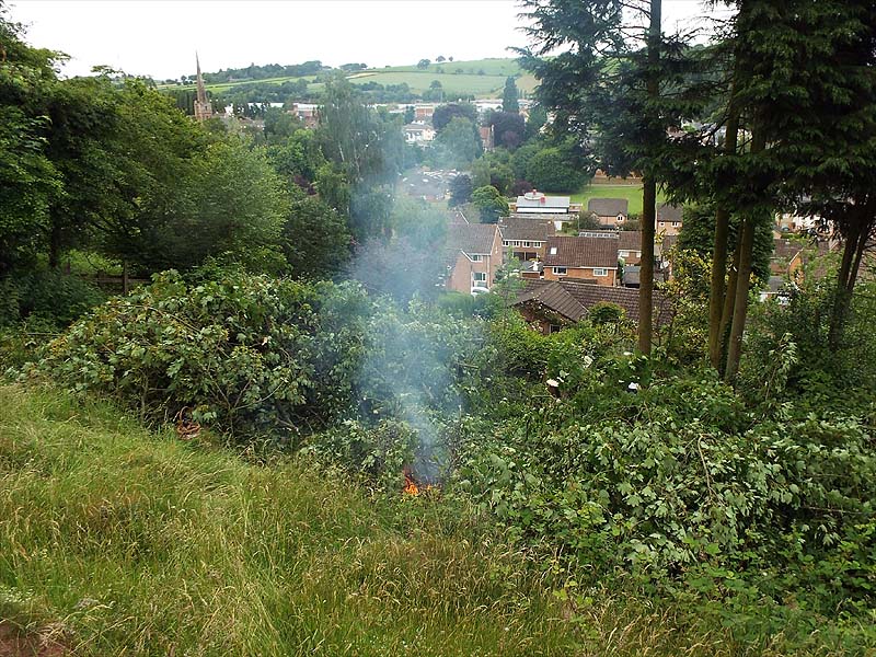 On Monday, two of TrunkArb'a finest returned, I assisted by accepting offcuts and trunk pieces in the field as the last Leylandii was dismantled. The fire needed only a small amount of my store of dried firewood to get going and by the time they finished three hours later, all the trash had already been burned. Three hours later there was very little left of the trunk pieces. They've all gone now and in a few weeks time the grass and brambles will have reclaimed the burnt area.