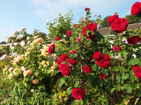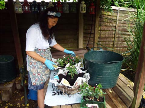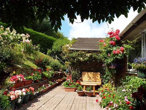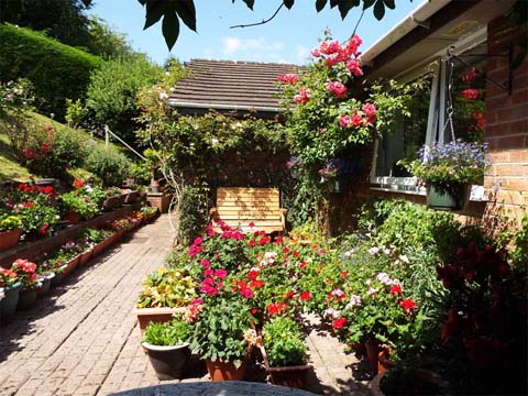 This page is part of a series of garden blogs from 2021. Click here for the index. I described some of June's weather as being 'sub-tropical' and then the first 3 weeks of July were totally 'tropical' with temperatures of at least 30 degrees. This part covers the lower garden and patio Click on a picture for a larger version and click on that to return to this page. Looking from the road, the garden probably looks like a controlled jungle to passers by. Look closely and the surfinias are there as usual as are some tubs on the steps There are a couple of geranium pots on the second wall and a mass of fuchsias and purple and white dahlias behind which will flower very soon. On the right at the bottom is what I call the 'yellow weed', you can pay good money for it at a garden centre but in our case it just walked in and took over, it's about the only plant that will grow there. At the top, the David Austin roses have again demonstrated their inherent quality, responding well to Yuehong's feeding and regular watering. The first flush will have lasted at least a month and depending on the weather there may be another one later. The patio has been a blaze of colour, there are multiple geraniums of various kinds and all sorts of other thirsty plants. Just how many was brought home when it was time to trim the Albertine rose and all the pots and tubs below had to be moved temporarily. We always buy a basic stock of fresh plants from the internet, local garden centres and even our local Lidl supermarket, then we sit back and wait for the clearance bargains. This year our chain garden centre on the other side of Newent has done us proud. We have taken to visiting once a week, it's a very pleasant drive through the lanes and on this occasion, the resultant additions were particularly photogenic. You'd never guess that Yuehong's favourite colour is red. Off the top of my head we have the following on the patio - begonia, busy lizzie, dwarf dahlia, fuchsia, geranium, lobelia, (African) marigold, million bells, nemesia, osteospermum, petunia, thunbergia, verbena. That's a left over pansy on the left and the red climbing rose has had an excellent year especially as it has to share with the precocious white clematis. The Albertine rose has more or less exhausted itself, its soil is limited and it has to share with two clematis. Of course, the pond has its water lily which would occupy every available inch if we let it. As it is we strike a compromise so the fish get some shade but enough light gets through for the weed they feed off to thrive too. That's the end of part 1. Click here to continue with part 2 which covers the upper garden. |