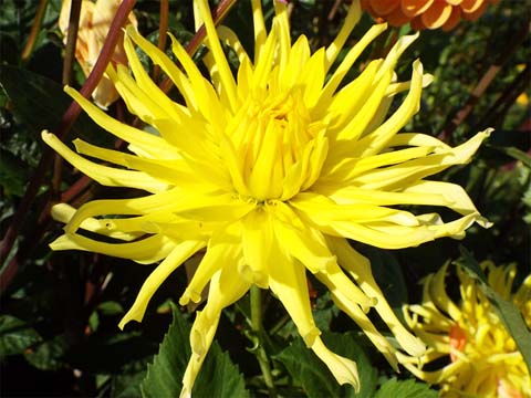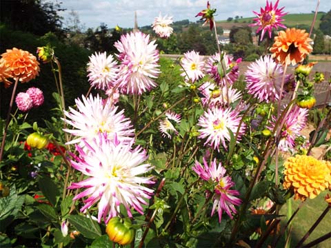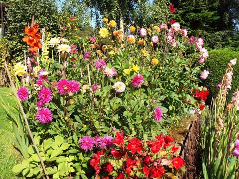 This page is part of a series of garden blogs from 2021. Click here for the index. I got a horrid surprise when I went to uncover the dahlia tubers in the garage in March. Normally just a few go rotten, this time it was far worse, I can only assume that several exceptionally cold nights had done for them. Some had survived rather better, not surprisingly this included the dark dahlias and the horrible purple and white ones. I recovered what I could, ordered a few more from our internet supplier and fortunately got a job lot of three kinds from Lidl. As such this year's displays are frankly an embarrasing shambles. There are no pictures of the bed by the road and the bed by our neighbour's greenhouse. Click on a picture for a larger version and click on that to return to this page. The best of what was immediately available went into the middle bed. There were almost no red survivors so it was a good job that we were later able to get remaindered red begonias and salvia to balance the colours. The sweet peas did very well and lasted (just) into August. The fuchsias were very late although just about all seemed to have recovered from their exposure to the cold. There were plenty of old and new gladioli which also flowered from early August, some of which are shown in the first part. The middle bed has been going strongly for just over a month as I write this, all the dahlias need is a little water and occasional dead heading. This year they will be treated with 'kid gloves' when it comes to storage. Both purple and yellow pointed varieties were among the survivors, there seemed to be at least one of most of my favourites that survived the massacre. The white pointed and large yellow varieties are new. Both of these are new - note the bee on the left. Our one major success was the 'new bed' on our southern boundary from which I had removed the useless blackcurrant and then had dug over and given the horse manure treatment. Necessarily they are not well positioned for photography but we currently have no neighbours in residence so I was able to hop over the low fence to record them. I have proved to be useless at recording and cataloguing our dahlias and for a couple of years, I have put 'lost label' examples in the vegetable patch. This year these went in next to the hawthorn hedge and some last minute additions were put next to the gladioli and dark dahlias. When they stuck their heads up it was clear that the dominant orange pompom and purple and white varieties were causing problems and they had ot be 'weeded out' and put in where the broad beans had been. A further complication was that Yuehong had been tempted into buying two marrow plants which are taking over what little space was left, you can see one in the bottom left. I am pleased to say that the weaker specimens are now starting to fill the gaps. At the back, the runner beans are now going well, especially as we had a couple of inches of rain yesterday. |
