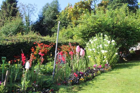 This page is part of a series of garden blogs from 2024. Click here for the index. Few people in England have thought much of summer 2024, it's been cooler than we have got used to and there's been regular rain throughout, but few deluges. I have to say that it seems to have suited the plants in our garden, something which came as a bit of a surprise to me. As a result, I have done a lot more 'hidden gardening' than usual as the various hedges and shrubs have all needed an extra cut. Within the last 12 months we have lost both neighbours on our north side. The executors in each case have apparently been in no hurry to tidy up but things do seem to be moving at last. However, I don't expect to have new neighbours before we go to Penang because both houses are very 'tired' and will need work done before anyone new moves in, not surprisingly neither garden is a 'picture'. If anything the south side is even worse. Our immediate neighbours are the latest (third) occupants to have given up and we now have a wildflower meadow there and I believe that the garden beyond is much the same as the black plastic sheet has simply disintegrated. To make matters even worse, we haven't seen the lady who used to keep sheep in the field directly behind us for months and that is now well on the way to being a wildflower meadow too. So as has been the case for a long time, we have been left to fly the flag for the traditional English garden, but for a change I am going to highlight Yuehong's contribution. Click on a picture for a larger version and click on that to return to this page. You can't tell it now but these beds in front of the bungalow suffered a full frontal assault by the roofers back at the end of May. Even those snapdragons that lost their heads are enjoying a premature second flush. The lobelia are fading now but have been amazing this year, the poor baby begonias didn't stand a chance. The petunias in the hanging baskets look much as they did then only they are rather larger. It helps that we haven't been away this year and Yuehong has been able to water them every day and give them a boost with fertiliser every week. In case of an unexpected late frost we usually buy some extra snapdragons and for them there is a convenient space next to the front door. We are in course of 'renewing' the bed behind the front wall. From the front we have fuchsias (long established), gladioli (relatively recent, more needed) and 50% peonies (more recent) and now 50% phlox. The last of these went in last year as 'proof of concept' and all the signs are that they will thrive. Next we have to work on the bed next to the steps where well established roses have been fighting a losing battle against he marauding deer. I wouldn't call the dahlia bed at the south end a disaster but it's clear my labeling system suffered a brain failure. It's not what I intended but it looks quite nice and our #1 giant dahlia made it to its reserved space in the corner. The greenhouse is full of tomatoes and this year Yuehong has, at last, followed the rule book. We have roughly the same number ripening but the plants are not as unhealthily leggy as before; as always we are very grateful to the Tyacks in Coleford who started them off for us. Unfortunately, although Yuehong's system can tolerate tomatoes in small quantities, she yielded to temptation, got all sorts of aches and now I have to eat vast numbers each day. Fortunately they go well with runner beans which she can eat. It's time to take a 'me break' before looking behind the bungalow. I've lost track of the number of large plastic buckets of off cuts from the front bank which have vanished for 'recycling' but it's well into double figures. Few people will notice when I give the rhododendrons and camellias a hair cut but the fuchsia hedge at the bottom would turn 'woody' shortly and needed urgent attention. We have an electric Bosch 'Hedgecutter' which is just perfect for the job and it took much longer to clear up than it did to cut. As you can see, that's four more bucketfuls ready to go up the steps for recycling. The bits from our neighbours French roses, bindweed etc which invade our space are neatly piled up just over the border. Two of these blue lilies appeared at the top of the garden this year, they are a little bit similar to Agapanthus but Google suggests 'African Lily' or 'Lily of the Nile'. The precocious red lilies are in three planters nearby having graduated from the patio a couple of years ago, splendid! We have one decent rose left in the top garden, why it hasn't (yet) been crippled by the moles, I have no idea. The bed in front of the wall now drains too well thanks to the mole tunnel system. I tried the usual red salvia but they did not go well and Yuehong suggested they would prefer a tub on the patio where she could cosset them - she was right. This year, she has 'done a job' with last year's African marigold seeds and they are far more tolerant of the conditions here. The fuchsias don't complain out loud but they don't flower much either. The top of the 'vegetable patch' has some rejects from the formal lily bed - red Crocosmia and white Phlox for both of whom the word 'precocious' could have been invented as far as our garden is concerned. After its makeover about three years ago, that bed again needs some attention, it's a place where I get no vote, maybe in 2025 it will come good. Since the picture on the left was taken, most of the dahlias behind the gladioli have stared flowering. but overall it's not been a good year, storage conditions in the wet winter were less than ideal. On the patio proper, there are always a few lilies in pots which can be watched carefully until they are strong enough to make the move to the top of the garden. For a few days, they really are utterly beautiful. Like the hanging baskets in front of the bungalow, these petunias are still going strong two months on. The patio is a classic location for begonias, occasionally th