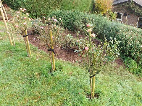 We bought a set of Autumn chrysanthemums for just a pound, unwanted by B&Q and now finally they are in flower. The baby standard roses have since been pruned, the bed behind had already been given the full 'tulip treatment'. The small azaleas will move out when they have flowered in the Spring and the whole bed will be filled with dahlias, potentially an amazing blaze of colour come next August.