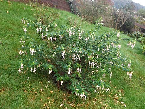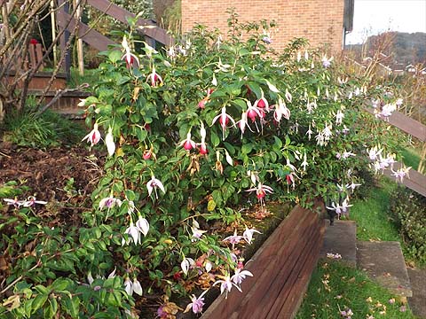 Some time ago we acquired some blue and white fuchsias which until this year have been a waste of space. They have been our star performers while most of the other fancy fuchsias have been nothing special. I hope they start slowly again next Spring because otherwise they will have to be severely pruned so the world can see the tulips!
