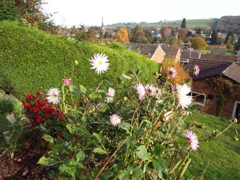 This page is part of a series of garden blogs from 2021. Click here for the index. The UK is a thoroughly depressing place at the moment. We have an incompetent government which also happens to be unprincipled and corrupt and, it seems, a majority of the population is totally unmoved by the fact. Unfortunately with the pandemic we have no winter escape and who knows what further problems await. So a rare sunny day brought me into the garden to cheer myself up because if you put the blinkers on, then it's almost possible to pretend that it's still summer. Click on a picture for a larger version and click on that to return to this page. First though, the autumn colours, I'm now starting to gather the leaf fall because it will be invested in our flower beds. First the forsythia and second the upper garden. The patio has been cleared and swept. Winter pansies are in the end tubs and the remaining smaller tubs of 'million bells' and African marigolds are squatting in the other two. Outside the living room we can also still enjoy the orange begonias which will need a proper frost to be finally halted. One dahlia has stood out this year. The camera suggests it is white but it's colouring is more subtle than that, the ends of the pointed part in particular are mauve. It's the last one in the ground in the upper garden. All around are others in groups waiting to dry out so they can be put in the garage once 'topped and tailed'. They will be joined by the large begonias but these red ones too show no sign of throwing in the towel just yet. The only baby begonias which are not in #1 greenhouse are those which went into the ground in early June, they were flowering then and are still flowering five months later. We do appreciate their colour but we will try to recover them when a frost is indicated, there should be room for them in #1 greenhouse against the south wall of the bungalow which will give them their best chance of surviving. If the petunias had eyes, they would be jealous of the cyclamen which spend the daylight hours on the living room windowsill. Next door, #35 now boasts a tidy lawn and hanging baskets with winter pansies, an excellent choice. In the foreground, Yuehong's dahlias refuse to give up, the red ones are finished but the pink and purple ones are still as good as the picture suggests. This is the view of them looking towards the greenhouse and it seems we were given an 'ugly duckling', a delicious orange one which has proved to be a late developer. We will keep them separate from the others and probably pop them back next year although not as closely spaced, we had no real choice this year as they were newly bought and started later than the rest. Our fuchsias were not impressed by our summer weather but eventually they condescended to flower; that on the left is in the bed in front of the upper wall and that on the right in front of the bungalow. In fact the fuchsias here were the exception, they had actually flowered very well until they had to be cut back for the new windows to be put in. We have traditional fuchsias along the patio, with all Yuehong's pot plants they are normally easily ignored but right now they have only the begonias as serious rivals and can be better appreciated. It would be fair to say that the fuchsias down by the road have been sulking but like their counterparts on the patio they have been doing well lately. Our purple and white dahlias grow and divide like weeds, they are now banished to the peripheries of the garden, but they too have to be prepared for overwintering. This is a small proportion of them sitting on the lower steps. They have already lost their 'tops' and have since lost their 'tails' or roots. There are two large planters at the bottom, far too heavy to move and they also have begonias. There are boxes and boxes of hyacinths and tulips old and new in the garage, it's still not cold enough to plant them out. Last year we had a 'cold snap' which wreaked havoc with the dahlias and begonias, this year I plan to wrap the most vulnerable ones and to keep them apart in our numerous Lidl cardboard boxes. |