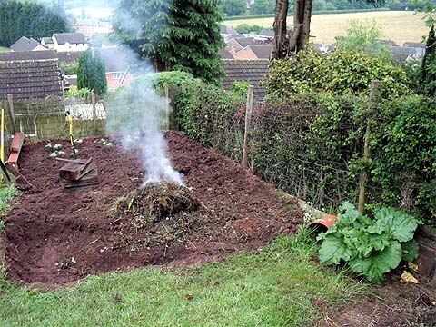Tidying up doesn't always please the wildlife, a slow worm had made itself at home in the moss over the rubble at the front and was gently relocated. With mass slash and burnings a thing of the past, the compost heap cum bonfire area has reverted to a vegetable patch and the odd frog has hopped off into the jungle next door. The rhubarb was inherited, the beans were a job lot from a charity shop in Ross-on-Wye. There are two rows now, the other beans coming locally and the bean canes from Huntley, it's not much fun carrying 14 of them on a bicycle for six miles, fortunately the first batch came in a neighbour's car just before we would have been refused permission to carry them on the bus.