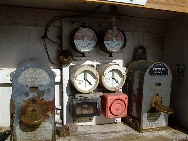 The Annett's Key system is used - http://en.wikipedia.org/wiki/Annett's_key. In this case it is electro-mechanical as the railway traffic is controlled by three aspect colour light signalling. The apparatus is clearly labelled BR-WR (British Railways - Western Region) and I would guess that it dates from the 1960s or 1970s at the latest. Under the brass key the instructions state: TO OBTAIN KEY AFTER RECEIVING SIGNALMANS PERMIT There are separate indicators for the up and down lines and I assume that the keys cannot be removed while a train is approaching. One of the keys is original, but the other is clearly a replacement (the Carriage Siding, Ground Frame is or was most likely in Gloucester):