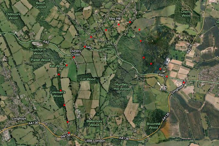 While Stagecoach may not be my or the world's favourite bus company, we would not be able to do this or several other walks in this area without their regular #24 service which, at the time of writing (June 2012), appears to have got over its previous reliability problems which saw services running late and cancelled owing to breakdowns. I ride free with my 'Freedom Pass' for over 60s and Yuehong buys a return ticket to the further point. In this case we get off at the top of the hill at Little London and return from the bus stop by the A4136 turn-off from the A40 in Huntley. And how about 'Flaming June'? Best not ask, at the time of writing, it seems as if Britain's two year drought may finally have broken. This map (from Google Maps) shows the route taken: