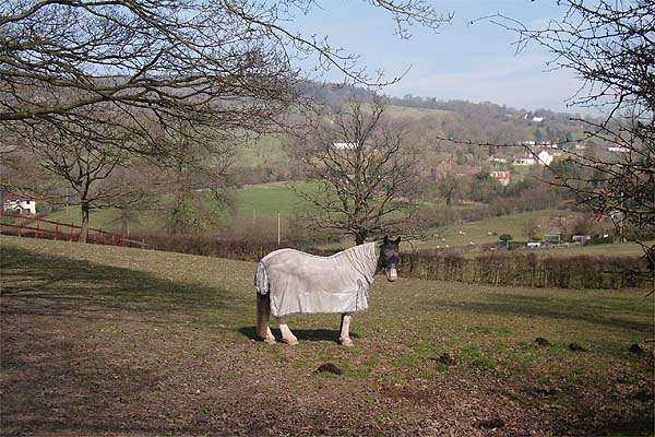 Just above the quarry, there is a lane down to Dursley Cross (on the A40), in March the nights were still cold enough for the horse to need a coat, behind is May Hill and the eponymous village is on the right.