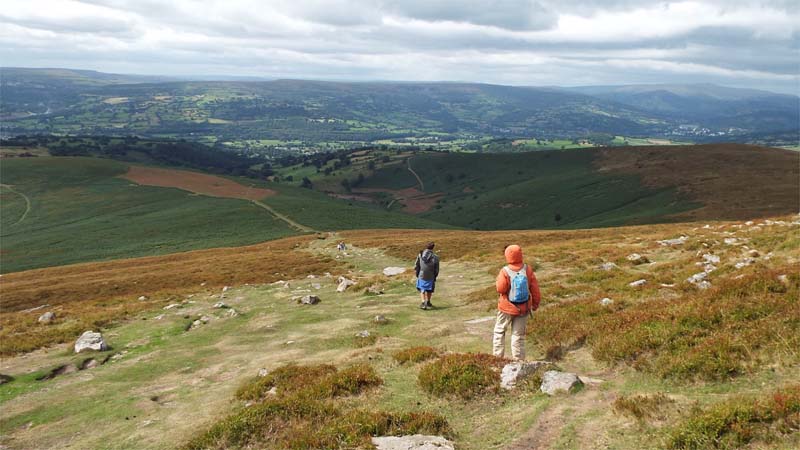 I was a little concerned that Yuehong's bad knee would not appreciate the descent but in fact it was sufficiently gentle and soft not to cause any problems. That's Crickhowell in the distance on the right side, with the Brecon Beacons beyond.