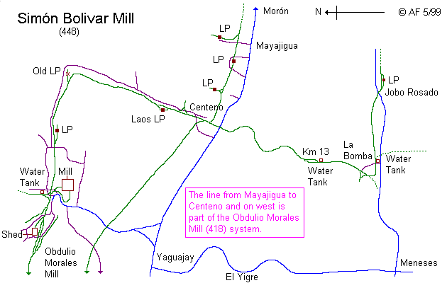 Simón Bolivar (Mill 448) was one of a pair of mills of unusual 2'3½" gauge, east of Caibarién. While its locomotives were invariably scruffy, the 'bank at Bolivar' was one of the stiffest tasks on the narrow gauge in Cuba, a steep climb for empties up to the plateau south of the mill - unfortunately I only saw workings on it during one of my visits. Click on a thumbnail to see a larger 750x500 (or similar) image then use the back button or links to return here. Click here for the 'Those were the days' index page. |