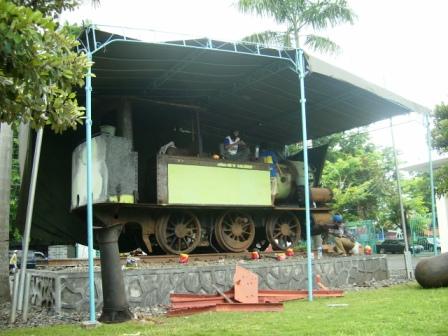 C1412 was constructed by Beyer Peacock (5180/1909). It was originally Serajoedal Stoomtram Mij 12. This 0-6-0T had two outside cylinders 280 x 406 mm with driving wheel diameter of 1003 mm. Boiler pressure was 12.0 kg/cm2, grate area 0.7 m2 with a heating surface of 36.0 m2. Overall weight was 22.3 tons. C1412 was preserved at the Ambarawa Railway Museum for many years, but was moved to PTKA HQ in Semarang in late 2008. In the 1970s the few of these locomotives that survived active were found around Purwokerto their original home. The top photograph is courtesy of Nick Bryant (2001), the lower Tjahjono Rahardjo (2008). Click here for the main unofficial Ambarawa Railway Museum Home Page. Click here for a full list of preserved Indonesian main line steam locomotives. Click here for more information about the steam locomotives at the Ambarawa Railway Museum. Click here for more information about the steam locomotives at the Taman Mini Railway Museum. Click here for more information about the other preserved steam locomotives in Java. Click here for more information about Java's forgotten steam locomotives. |