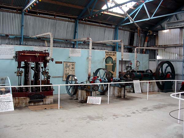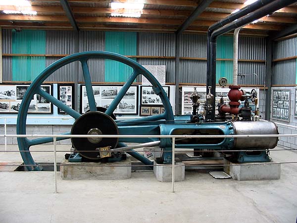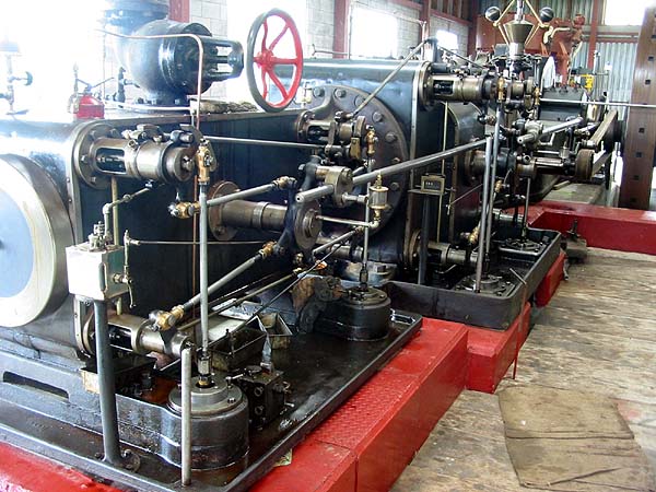 the Driving Creek Railway, The next day, we called in at the Waihi Goldfields Railway, a short section of the ex-main line which operates daily, alas mainly if not exclusively, with a 'heritage' diesel shunter... Best steam action of the day was the geyser at Rotorua: We stayed in Turangi where the attraction was a home-brew hotel, again it was a bit of a disappointment with bland fizzy beers. By now the Mainline Steam tour had reached Napier, there being relatively less active steam on the North Island so this was our focus for the next few days. On 21st October, we visited the Tokomaru Steam Museum which is some 20km south of Palmerston North. This has a short oval section of track which is operated on selected Sundays by an ex-Napier Harbour Fowler 0-4-0T. A Manning Wardle 0-4-0ST was also said to be serviceable and they also have a Climax and Price C in 'unrestored condition'. More impressive is their collection of nearly a dozen operable stationary steam engines (and more waiting their turn). Star of the show is a huge American engine built in 1906 for a meat chilling plant, the detail shows the Corliss valves on one of its compressors: Among several Tangyes is this large two cylinder machine: Also present are New Zealand's oldest steam engine (1868) and two steam