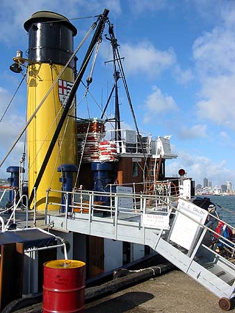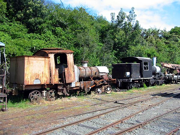 site At Waitara, north of New Plymouth, we briefly visited (23rd October) the embryonic preservation site which will eventually operate the branch to Lepperton Junction/Sentry Hill, http://members.tripod.com/waitararailwaypres/. A workshop was being erected and there were pieces of 2/3 'river' locomotives on site. Early days! After a day travelling up the deserted and scenic back roads of the west coast we popped into the Bush Tramway Club Railway near Huntly, http://www.bushtramwayclub.com. This operates only on the first day of the month (April to December - not high Summer owing to fire risk). The F class looked serviceable, the Climax Cb was awaiting final boiler repairs and a Pecket 0-6-0ST was in pieces. All the other classic steam locos were 'unrestored'. Also on site is a large assortment of small diesels in states varying from derelict to running. The picture shows a Climax (right) and a Price derivative of it (left). My final weekend was spent based in Auckland. On 26th October it was the first day of Glenbrook Vintage Railway's new season. This is by some way the 'premier' preserved operation in the country, attracting some 30,000 visitors a year. Ww 4-6-4T 480 was working the trains on a blustery day when the rushing clouds always seemed to appear at the same time as the train. The first picture shows 480 being coaled with a compressed air crane: And then in action on the line: Glenbrook's Mallet is now stored pending boiler repairs: The steam tug William C. Daldy operates out of Devonport during the Summer