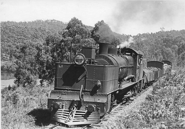 T.G.R Garratt locomotive "L" class No. 1 (BP 5525/1912) powering up grade past Horse Head Creek with a mixed goods train on the T.G.R. Western Line near Devonport (Tasmania's North West Coast) in 1944/45.