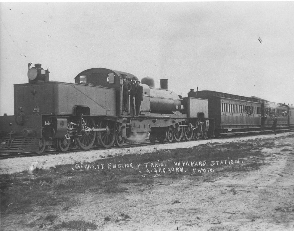 T.G.R. Garratt locomotive "M" class No. 1 or 2 on a special passenger train at Wynyard station (North West Coast of Tasmania). The train was used to celebrate the official opening of the Myalla to Wiltshire Junction extension of the T.G.R. Western Line on the 12th of july 1922.