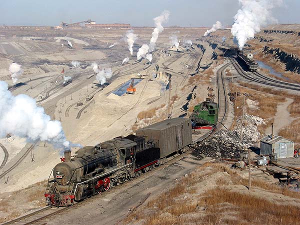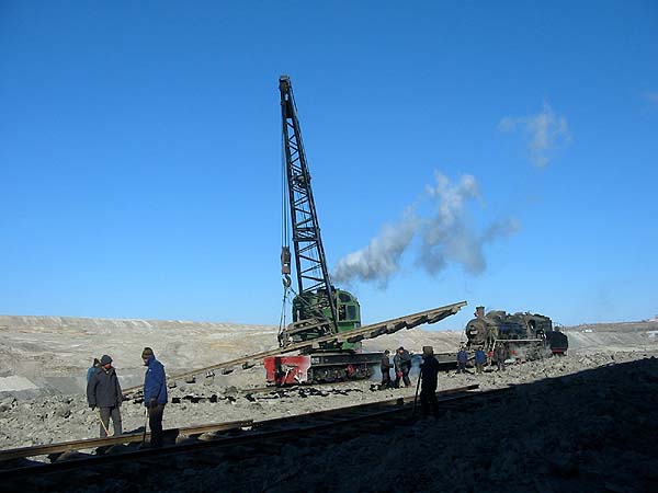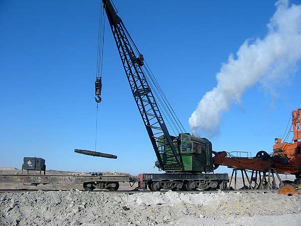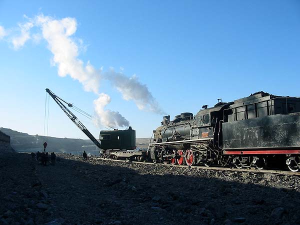Jalainur has a considerable number of steam cranes which are an integral part of their operation (although large electrical cranes / excavators do the bulk spoil and coal movements), here the crane is part of a panorama which includes evidence of at least 18 steam locomotives at work: