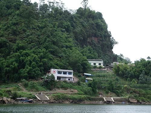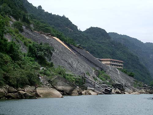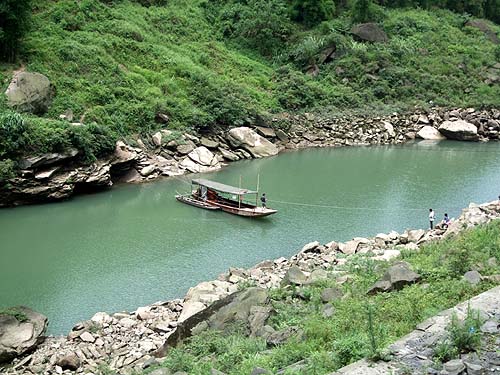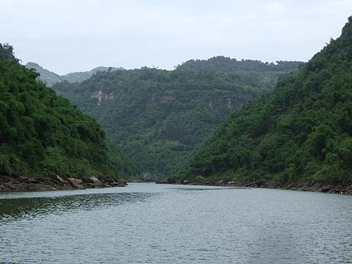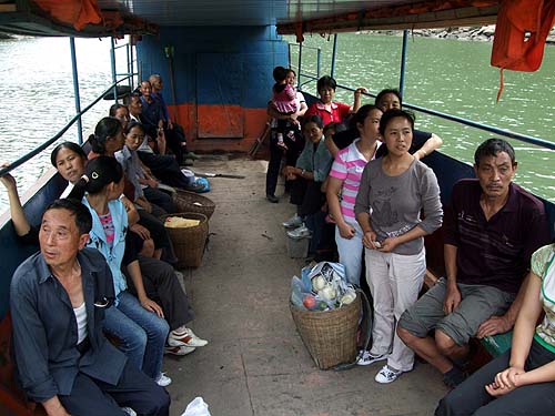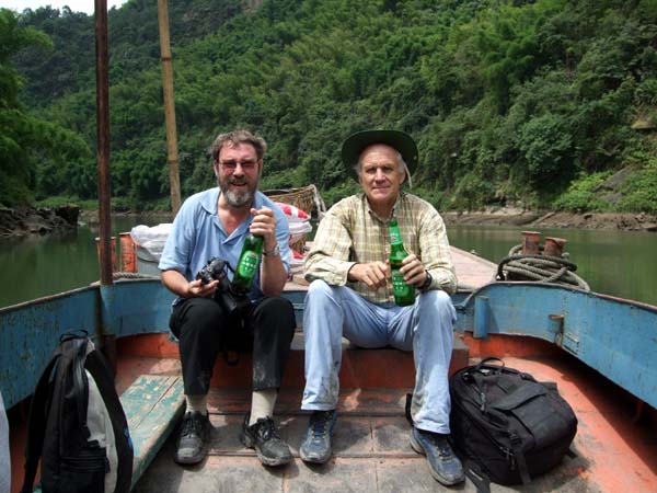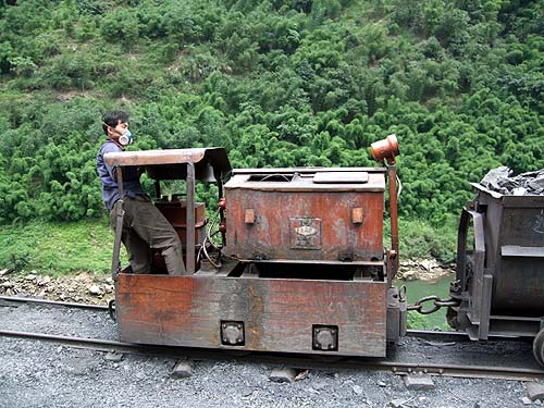 Click here for the main Shibanxi Holiday 2009 page. It was time to return to Ma Miao, east and south of Bagou on the map, our plan was to take a boat up to the dam below Huangdan (bottom left) visiting the waterside coal mines on the way. It was raining when we left Bagou, but not significantly, and we made good progress. This time the mine featured before was working and I spent an hour here mainly shooting video. The battery electric loco wa s in pieces and all horizontal movements were man powered. The first skips up were spoil which ascended the incline to be dumped: Later coal of dubious quality surfaced and was stockpiled: Tipping of the next wagon didn't go quite to plan, I have the extraordinary action on video: When I reached Ma Miao, our expected ferry was not available and we joined what appeared to be a regular Monday public ferry, with the promise it would go further than normal if we paid... By now the sun was out and I was wilting after all the rush to get filming complete, we had brought just one camera to keep the weight down. Even a cold beer couldn't revive me: The scenery was magnificent again, of course, and in due course we lost our passengers: