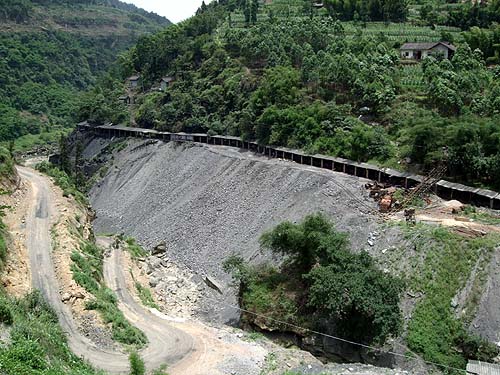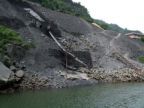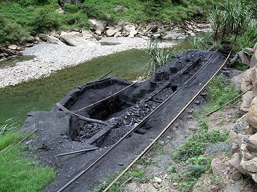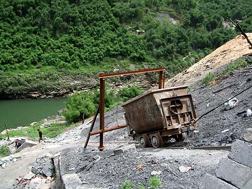 There was one more coal mine before the dam, a relatively new and large operation, clearly prosperous as the owner was constructing a large concrete girder bridge across the gorge to avoid using the dirt road behind his mine. As a result the cableway and the ferry would shortly become redundant. It was still lunchtime at there was nothing of any significance visible on the small amount of railway which was not underground: