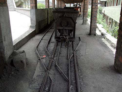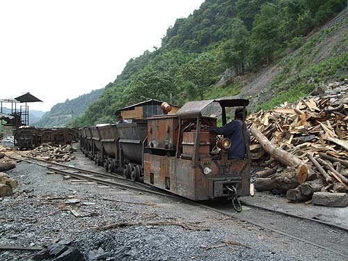Up above, the trackwork was a wonder to behold, 300mm and 600mm although it seemed very likely that the former was disused. It was lunch time, we had more mines to visit so we saw very little movement, save one of their two diesels seen backing into the mine. This was clearly an expanding operation and a clear recipient of some of the trees we had seen being stripped out of the hills on our previous trip to Huangdan.