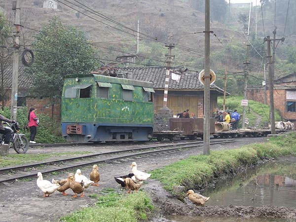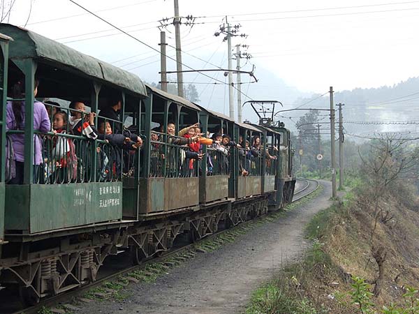 The after school passenger train taking the kids home........a noisy, friendly bunch! A few years ago this train would load to 12 coaches but the new concrete road to Laokuang seems to have taken a lot of the passenger traffic. Judging by the lack of coal trains and the number of big blue trucks seen transporting coal I reckon most of the lines traffic has moved to road now.