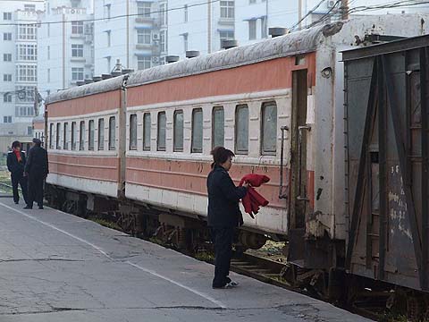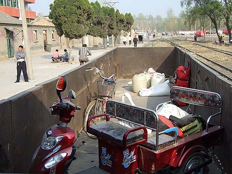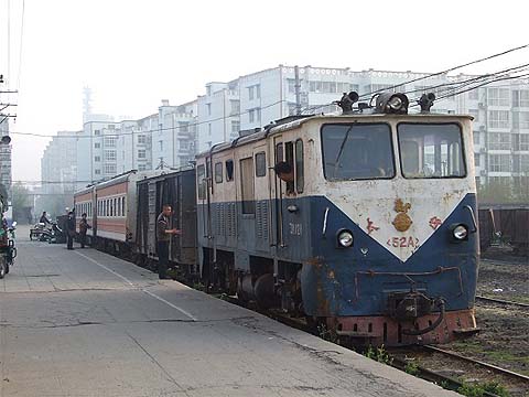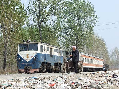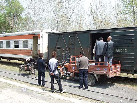 The substantial station building at Taikang (left). A lot of the stations were major buildings although either derelict or fast becoming that way. Surprisingly we stopped at most stations to either pick up or set down passengers and at all stations there was someone with flags to signal the train through. Freight being unloaded at Huaiyang (right). The two people closest to the camera are train crew: on the left a carriage attendant and standing beside her the travelling maintenance man. His job seemed to consist of checking for hot boxes each time the train stopped but will always be remembered for attempting to change a light bulb on the return journey and plunging both carriages into darkness for the last two hours!