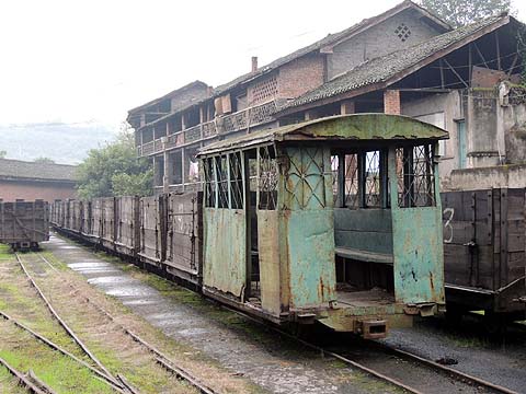 I then returned to the junction and followed the line that headed off to the left. Well I had nothing else to do and it was too early in the day to head back to Chongqing. This took me to another walled compound where I found the rolling stock. This area appeared to house various maintenance workshops but no one was around and it certainly looked as if nothing had happened for some time.