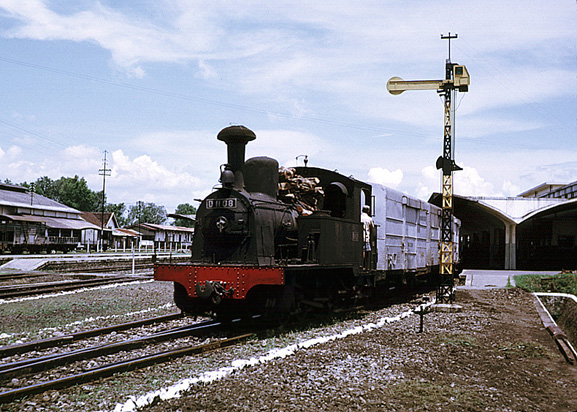 D1108 is station pilot at the Malang Kota Baru ('new town') station on 9th April 1974. The shed is on the left in the background (CH)