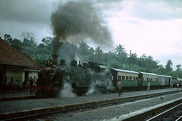 CC1032 waits at Cibatu with a train for Cikajang on 13th August 1975. As I have recorded elsewhere, attempts to photograph these locomotives when working hard were inevitably frustrated by massive steam leaks. (RD) |